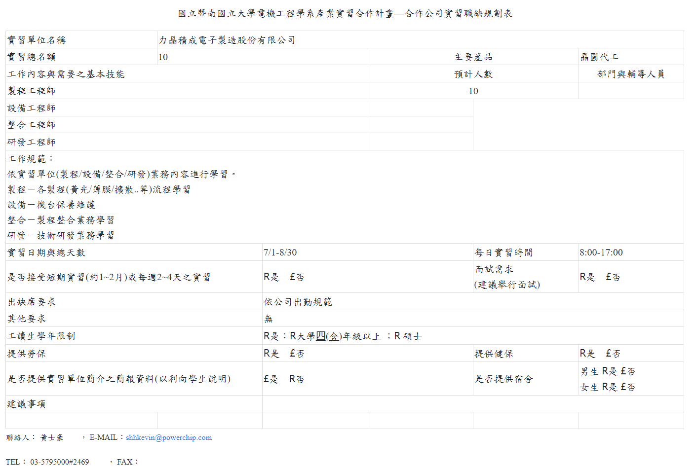 轉知:力晶積成電子製造股份有限公司暑期實習資訊