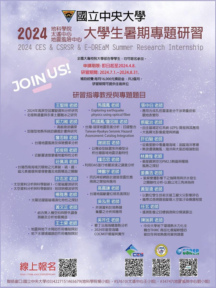 轉知:中央大學地科院暨太遙中心辦理「2024大學生暑期專題研 習」訊息