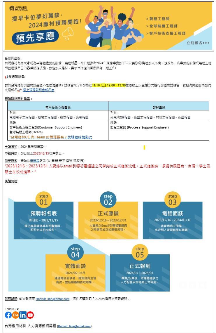 轉知:台灣應用材料 FY24預聘計畫徵才訊息