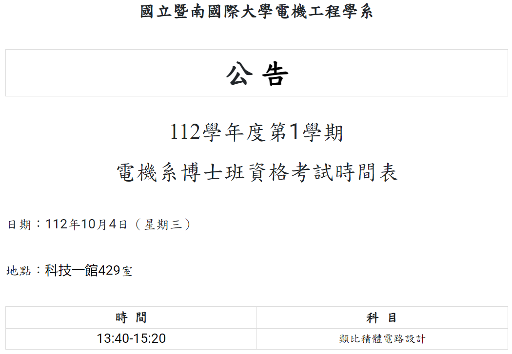 公告:112學年度第1學期電機系博士班資格考試時