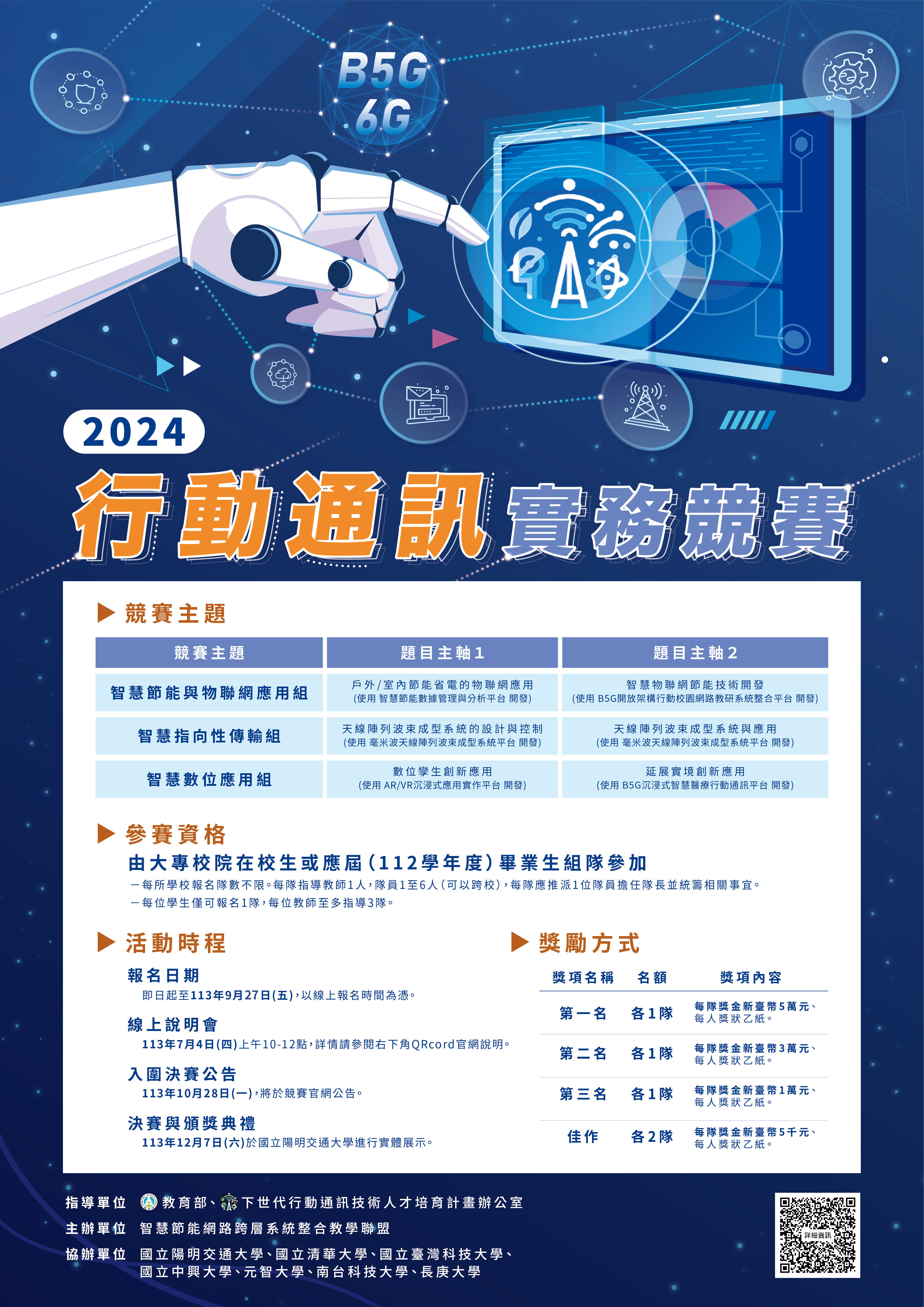 轉知:國立陽明交通大學校智慧節能網路跨層系統整合教學聯盟主辦之 「2024行動通訊實務競賽」報名訊息